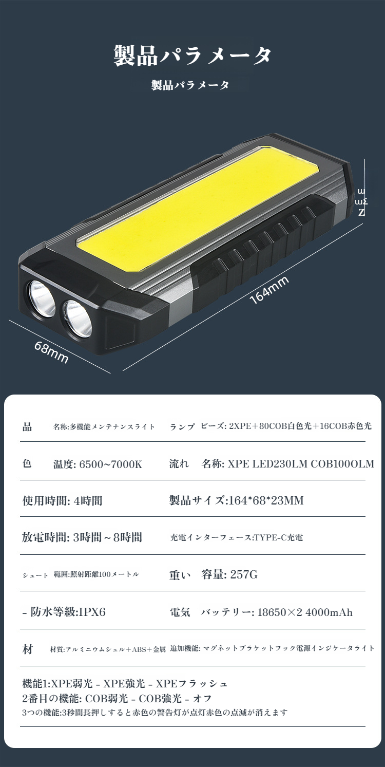 多機能懐中電灯 修理車の強いライト充電式ランプ 多機能マグネット充電式懐中電灯